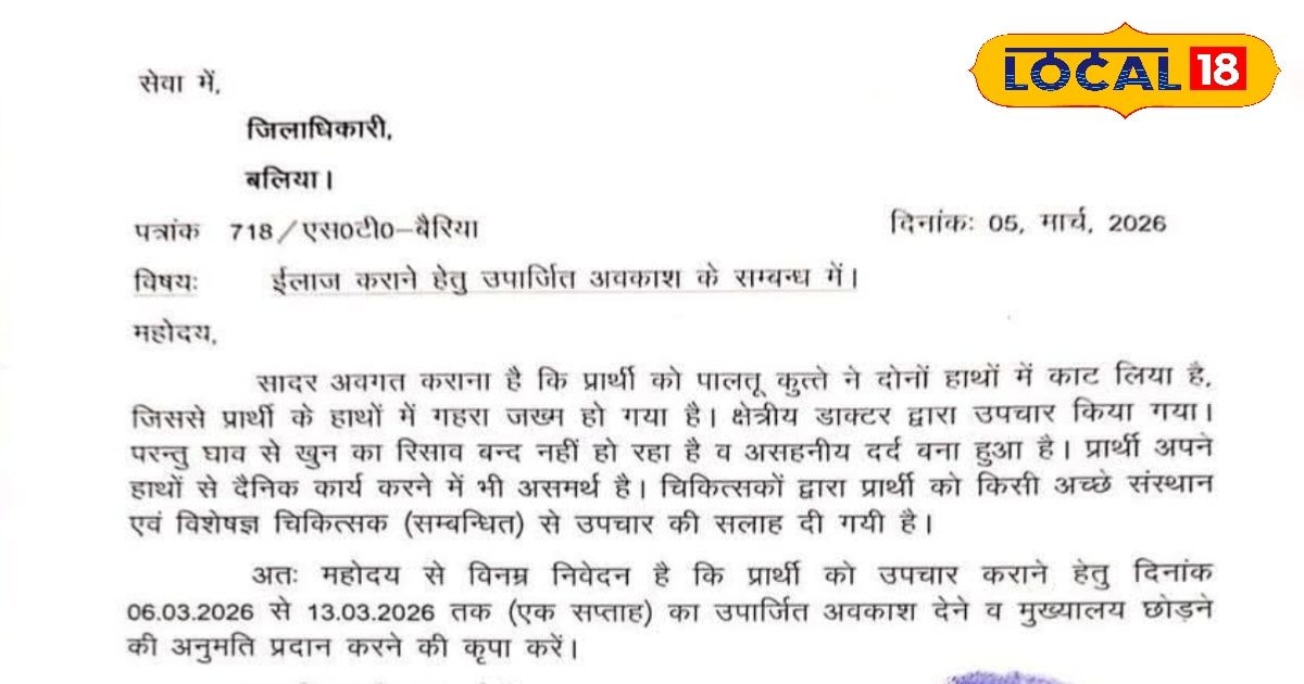 आपको बताते चलें कि, जनपद बलिया के बैरिया तहसील में उप जिलाधिकारी यानी SDM के पद पर कार्यरत आलोक प्रताप सिंह ने अपने आवेदन में बताया है कि, उन्हें पालतू कुत्ते ने दोनों हाथों में बहुत दर्दनाक काट लिया है, जिससे घाव बड़ा खतरनाक हो गया है. हालांकि, SDM ने स्थानीय डॉक्टर से इलाज कराया है, लेकिन उसके बावजूद भी घाव से खून का रिसाव और तेज दर्द बना हुआ है. SDM के खत के मुताबिक डॉक्टरों ने बेहतर इलाज के लिए किसी बड़े संस्थान में दिखाने की सलाह दी है.